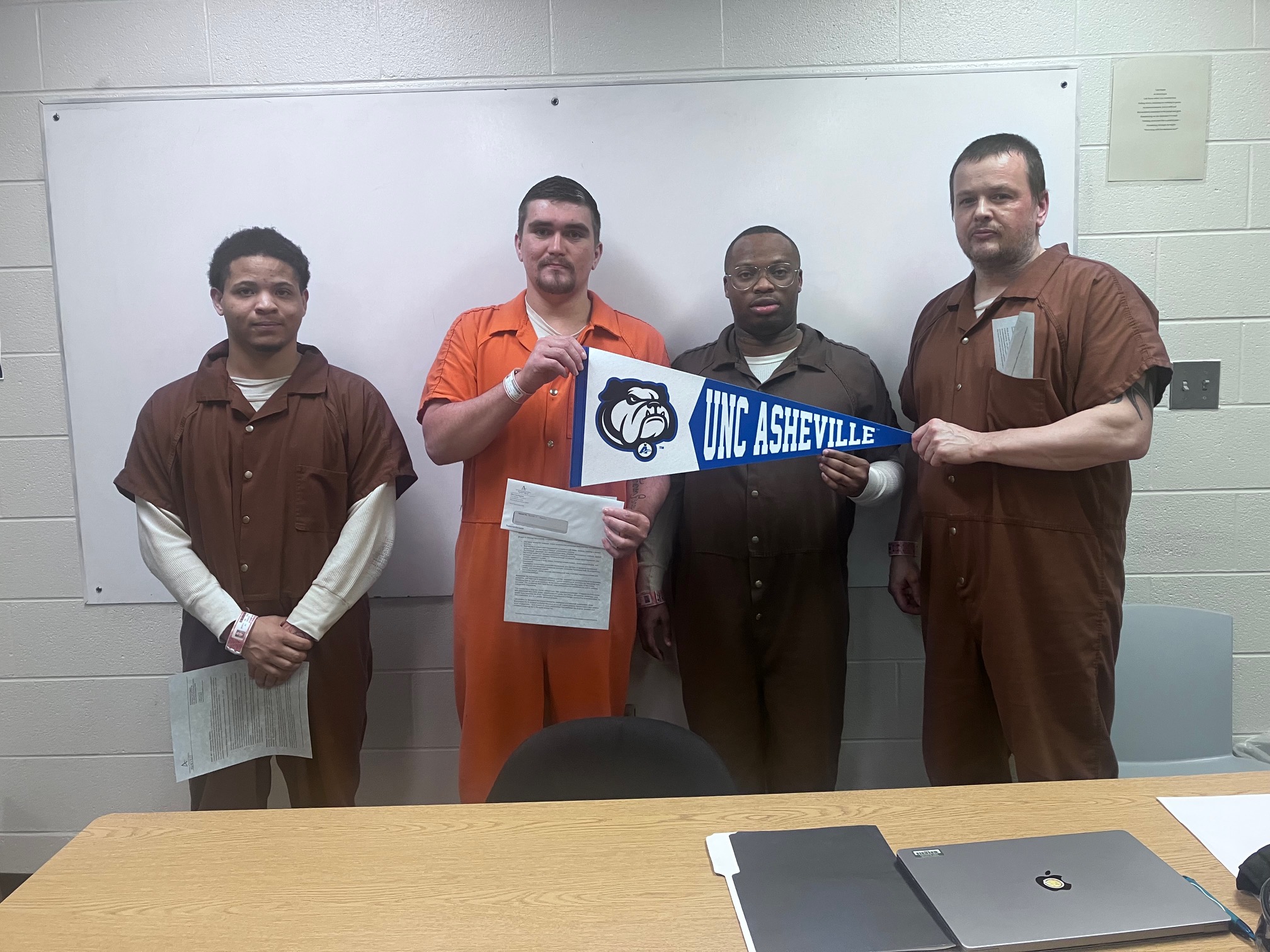 Small but deeply meaningful ceremonies held in a tiny classroom at Buncombe County Detention Facility mark the completion of each UNCA class, conferring hard earned college credit to men and women detained there awaiting trial. These ceremonies – complete with speeches, handshakes, official college transcripts, cherished cups of coffee and sweets, and an appreciative audience of Buncombe County Officials – also mark the crossing of a powerful threshold, conferring a distinction of “scholar” to people most often identified as detainees.